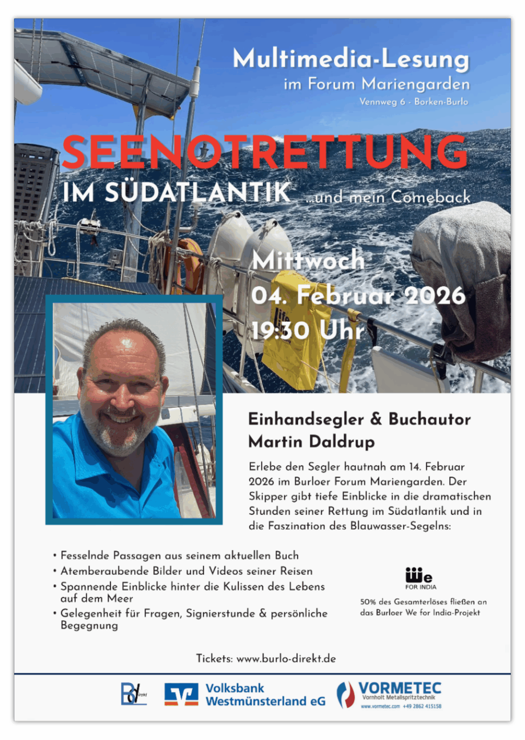 Erlebe Martin Daldrup während seines kurzen Deutschland-Aufenthalts hautnah am 4. Februar 2026 im Burloer Forum Mariengarden. Der Segler gibt tiefe Einblicke in die dramatischen Stunden seiner Rettung im Südatlantik und in die Faszination des Blauwasser-Segelns. Freuen Sie sich auf einen faszinierenden Abend.